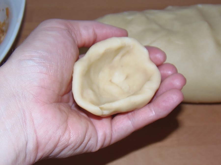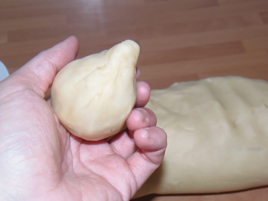 - Hacemos un rollo con la masa y vamos cogiendo porciones, les damos forma de bola y luego hacemos un hueco, como una bolsa