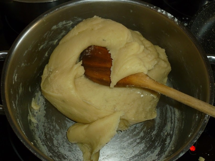 Cuando hierva, añadir los 500 g de harina y revolver sin parar y bajar el fuego al mínimo.