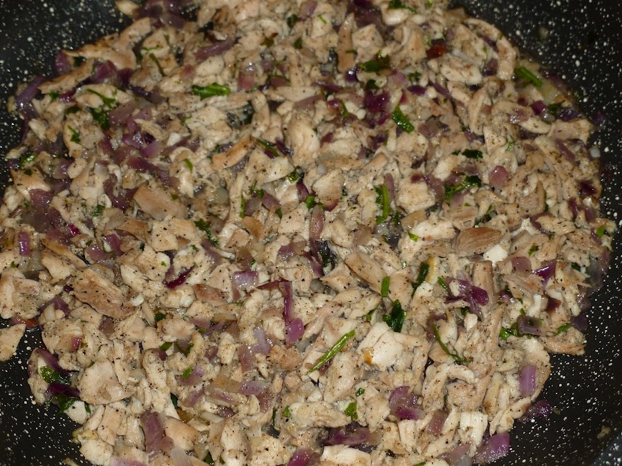 Desmenuzar la carne del pollo y añadirla a la sartén, añadir dos o tres cucharadas de caldo de pollo, el perejil y salpimentar.