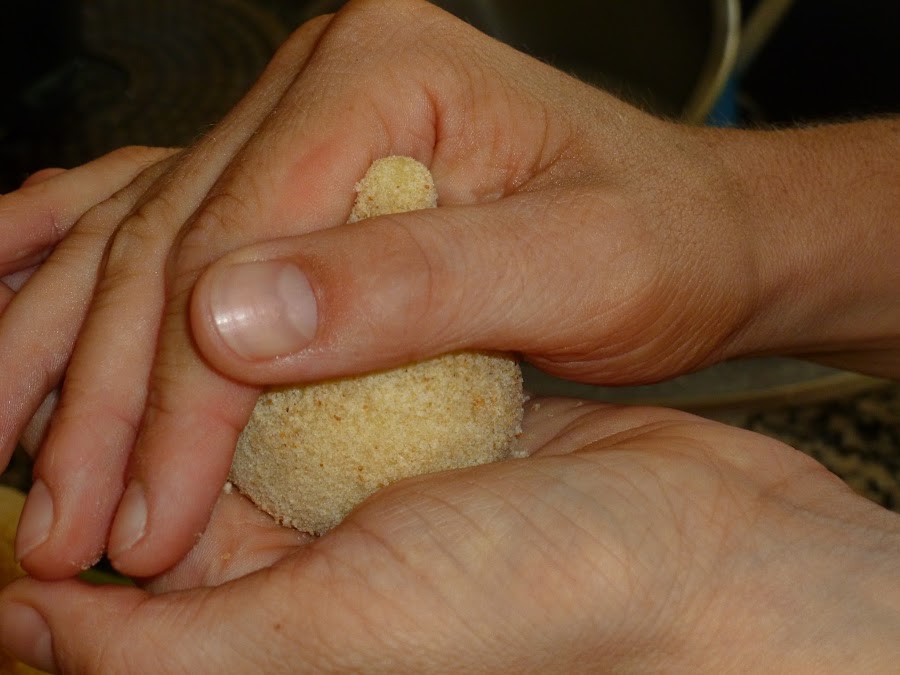Para formar las coxinhas, hacer una bola con el trozo de masa y hacerle un agujero en el centro hundiendo el dedo. Ir aplastando un poco los bordes para dejar un hueco. Colocar una cucharada sopera de relleno en el hueco y cerrar la coxinha dándole forma de higo.