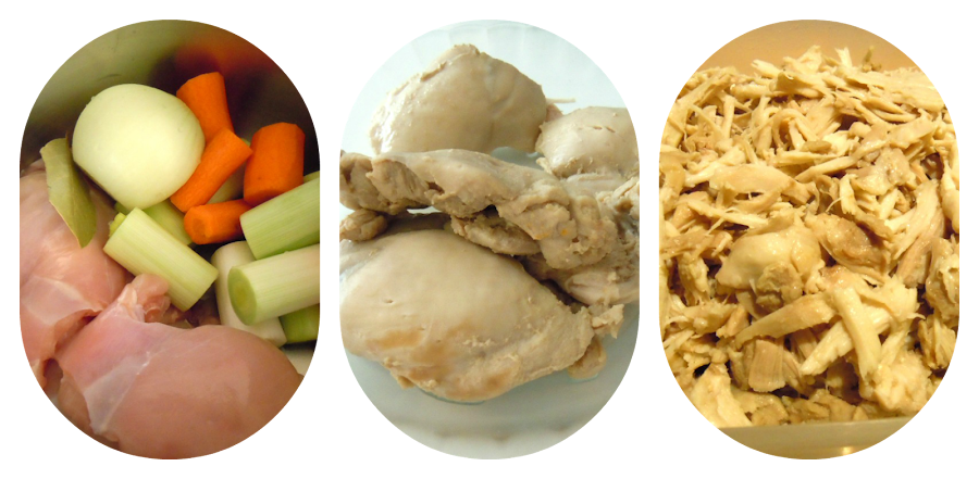 Empezaremos preparando el caldo de pollo. Para ello pondremos todos los ingredientes en una olla junto con una cucharadita de sal y como 1 y medio de agua. Dejaremos cocer como 30 minutos. Cuando este el caldo, lo colamos y reservamos los contramuslos en un plato. Cuando se enfríen los deshacemos con los dedos en trozos pequeños.Reservamos.