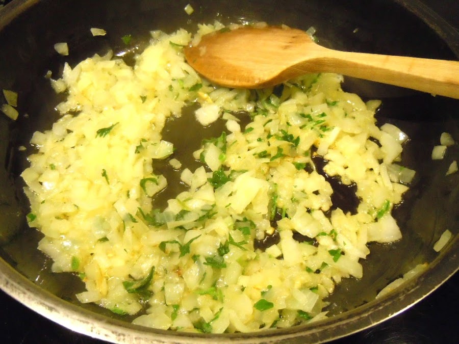Para preparar el relleno de las Coxinhas picamos la cebolla y la pochamos en un poco de aceite. Picamos el perejil y lo añadimos. Ahora agregamos el pollo desmigajado, el chorrito de caldo, una pizca de sal y espolvoreamos pimienta blanca, ajo en polo y pimentón picante al gusto. Removemos bien, dejamos reducir el caldo unos 2 minutos y reservamos hasta que se enfríe.