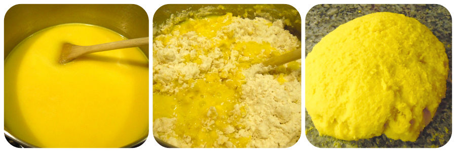 Cuando esté medio fría la masa, la colocamos en un bol, la tapamos con film transparente y guardamos en la nevera hasta que esté fría. Después la amasaremos hasta que sea manejable (no se os debería pegar en las manos, si se da el caso, espolvorear un poco de harina en la mesa y trabajar)