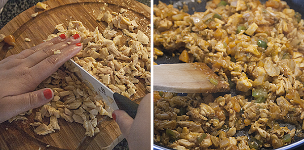 Desmenuzamos el pollo y lo picamos en trozos pequeños.