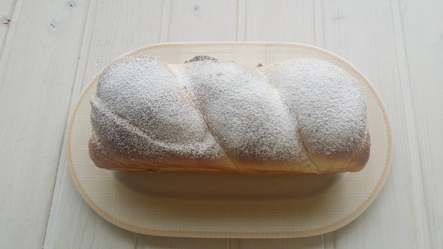 5. Cuando termine el programa, al cabo de una hora y media, la masa habrá levado y doblado su volumen. La dividimos en dos partes, le quitamos el aire, y la estiramos un poco sobre una superficie enharinada. Sobre cada una de las partes repartimos la mitad del relleno. Enrollamos cada una de las partes, las trenzamos entre sí y colocamos en un molde cuya base habremos forrado con papel de horno y cuyas paredes habremos untado con mantequilla.