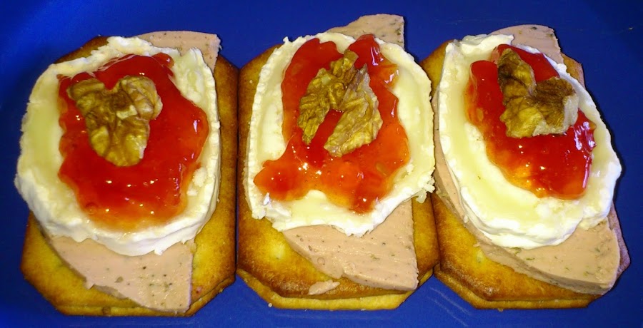 Poner sobre los crackers el foie, el queso de cabra, la mermelada de tomate y coronar con una nuez.