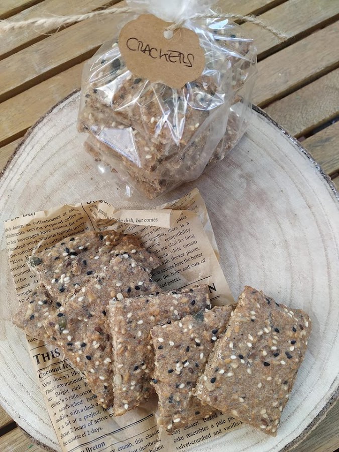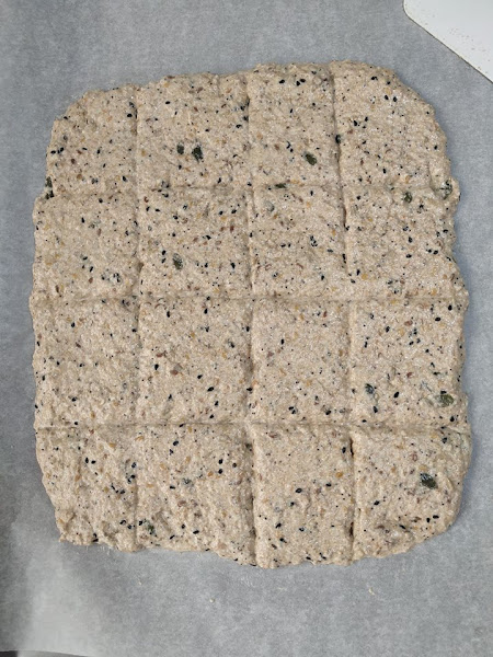 En un bol ponemos todos los ingredientes y mezclamos bien, preparamos una bandeja de horno con papel vegetal, vertemos la masa y la aplastamos con ayuda de una espátula, le damos forma de rectángulo con un grosor de 0,5cm aprox. y marcamos con un cuchillo cuadrados para que se marquen en la masa y luego darle forma a nuestros crackers.