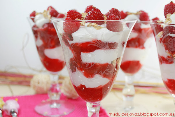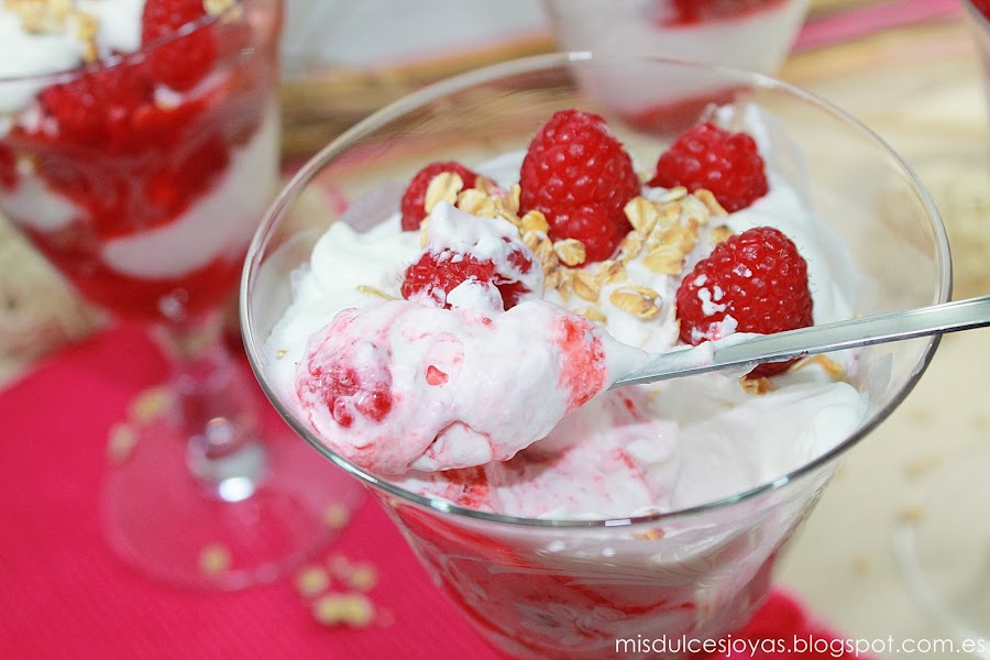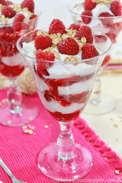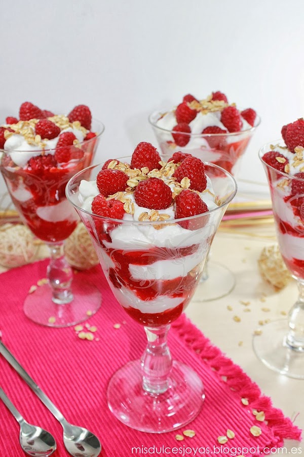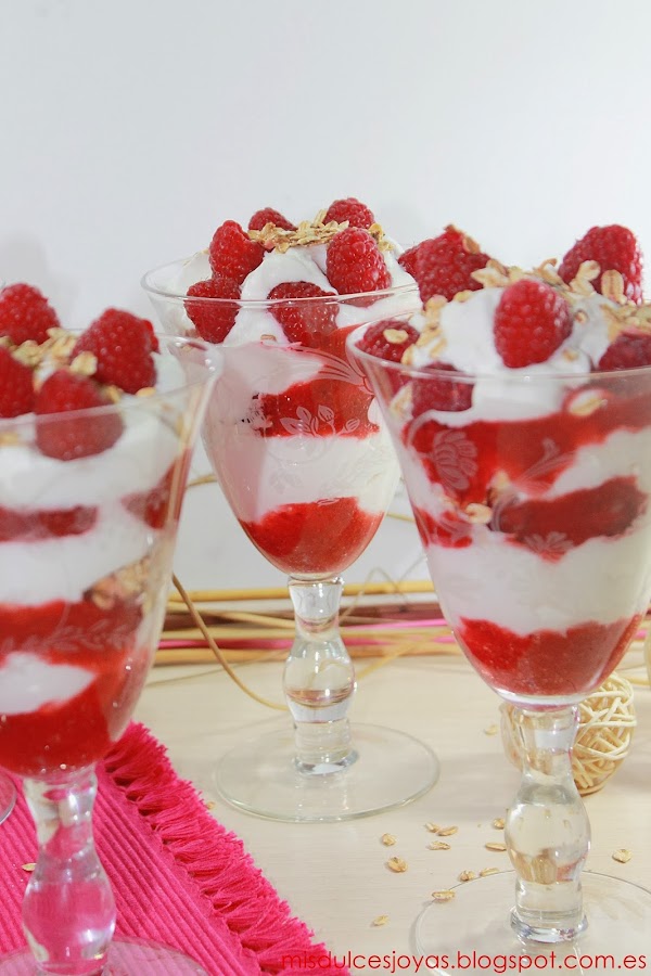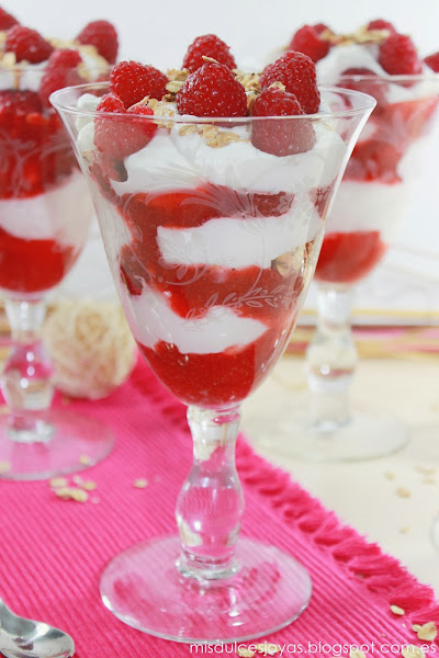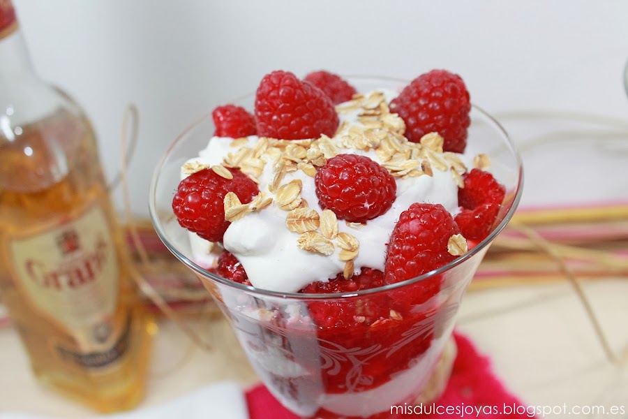 De hecho yo he preparado el Cranachan con frambuesas y fresas. Y con las fresas he hecho un coulis de fresa y las frambuesas las he dejado enteras. Esta combinación me ha parecido interesante, ya que da gusto encontrar las frambuesas enteras en la boca sin machacar, así se aprecia más su aroma y perfume característico e natural, y el coulis de fresa le aporta a este postre mayor textura, como también color y otro aroma añadido.