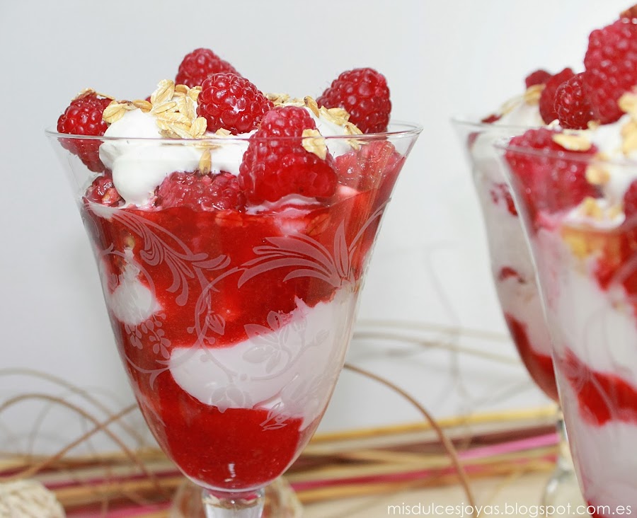 Ir formando y alternando capas de coulis de fresa, frambuesas, nata montada (crema de leche) y copos de avena, en unas copas o vasos de postre. Cubrir la última capa con unas frambuesas y unos copos de avena, y si se prefiere con un poco de miel.