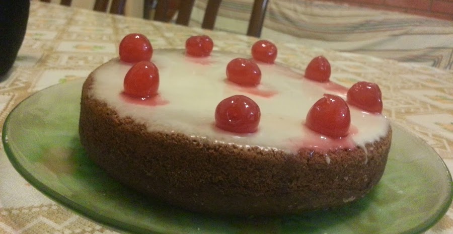 Este en específico lo decoré con glasé sencillo y cerezas de las que compras al estilo mascarpone.