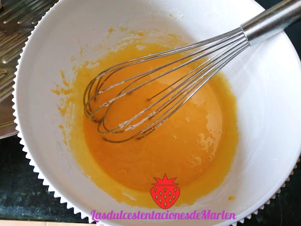 Pon en un cuenco las 6 yemas, añade 125 gr de azúcar y mezcla para que se integre el azúcar. Añade luego 40 gr de maicena y vuelve a mezclar.