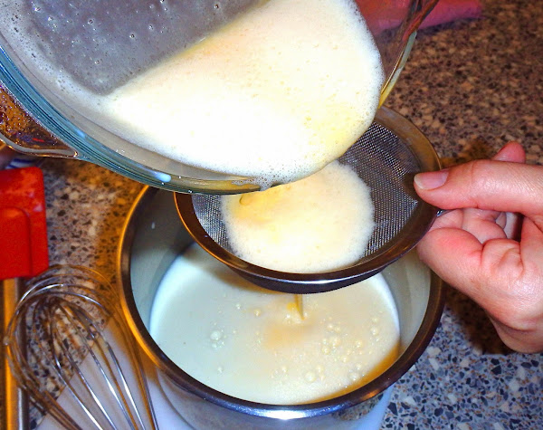 Ahora colándola por un colador de malla fina incorporaremos esta mezcla a la leche infusionada a la que habremos quitado la piel de limón y la canela.