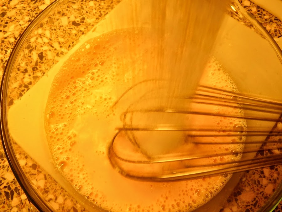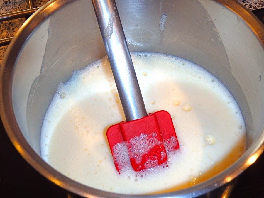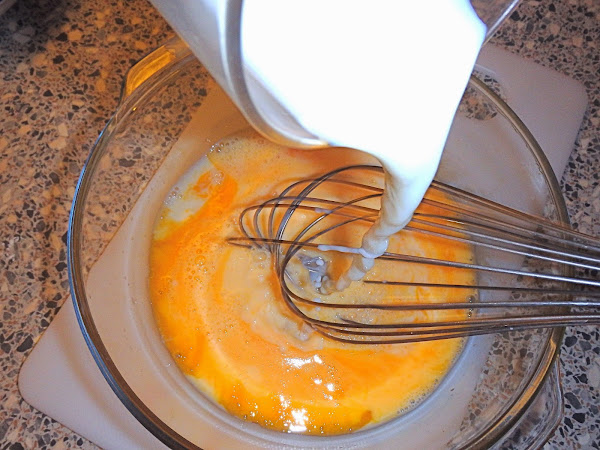 Añadimos a las yemas batidas la leche que nos quedaba, a temperatura ambiente, y lo batimos bien.