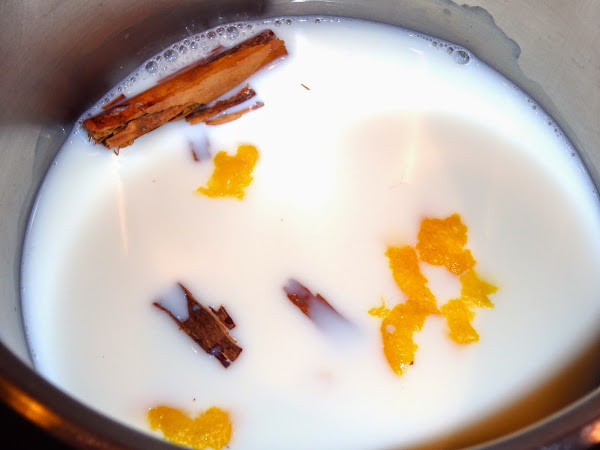 Posem a escalfar 2/3 de la llet amb les peles de llimona i el canó de canyella. Quan arrenqui el bull apaguem el foc i deixem que la llet infusioni durant uns minuts.