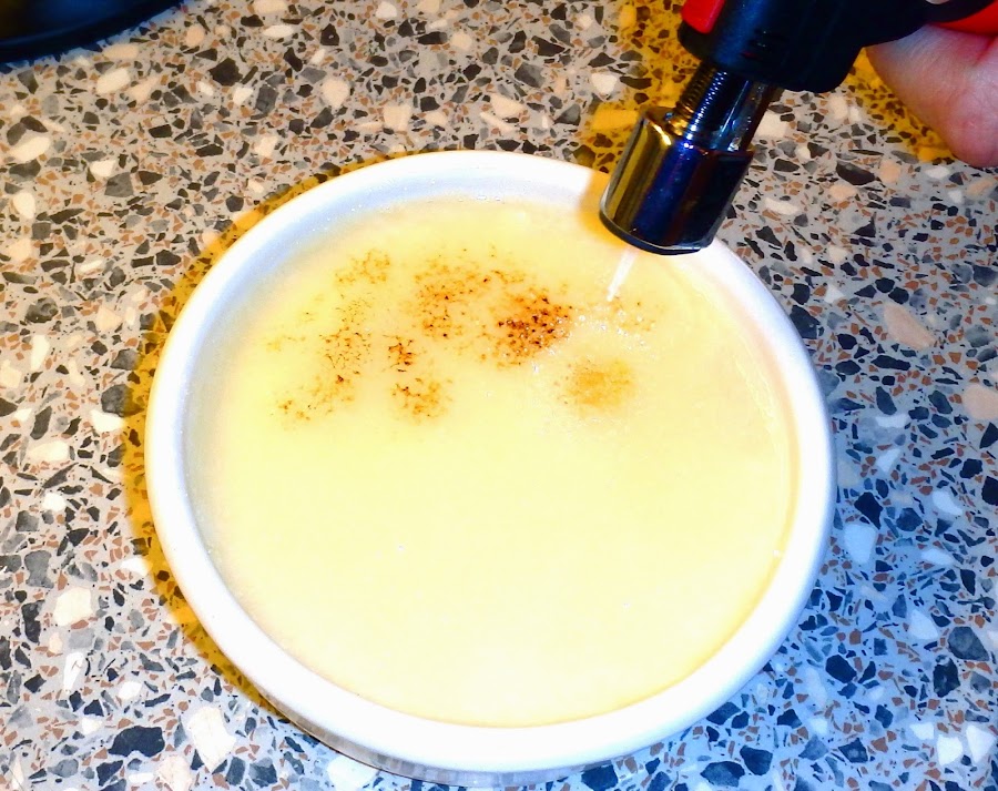 Cinco minutos antes de servirla podemos espolvorear por encima una cucharada de azúcar y quemarla con una paleta de las que hay para este menester o un soplete doméstico como hago yo. Es importante no quemarla antes ya que el caramelo perdería el crujiente y además la crema nos quedaría como húmeda. Tambien se puede comer sin quemar ¡está buenísima de las dos maneras!