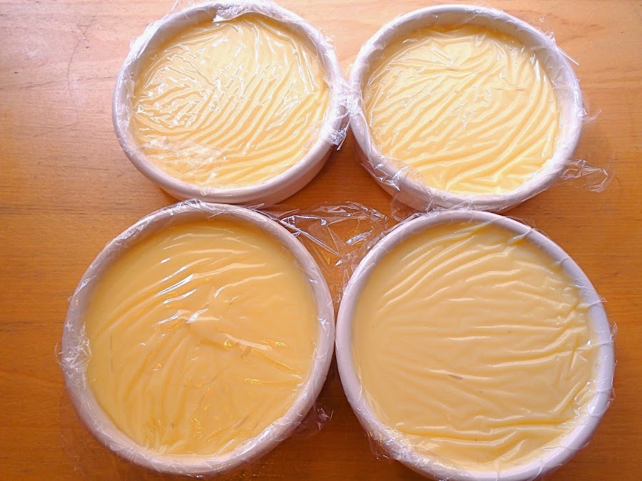 Una vez tengamos la crema a nuestro gusto la pondremos en cuatro recipientes adecuados y la taparemos con papel film, tiene que estar en contacto con la crema, de esta manera conseguiremos que no se nos forme una película seca y dura por encima. Una vez la crema fría la guardaremos en la nevera hasta el momento de usarla.