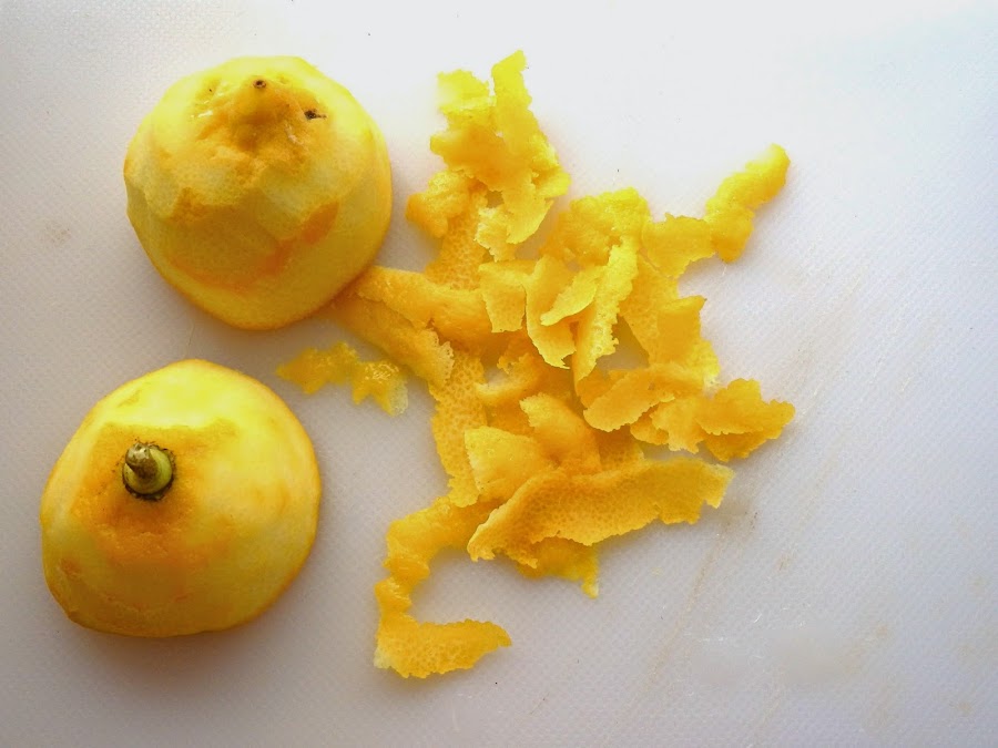 Treiem la pela de la llimona procurant que no tingui gens de part blanca, només la part groga, ja que la part blanca amargaria.