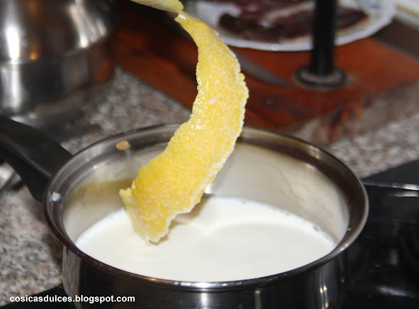 Llevar a ebullición la leche con la canela y la piel de limón.
