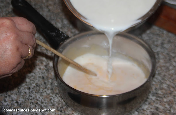 Batir en un cazo las yemas con el azúcar y la maizena. Una vez bien batido agregar sobre la leche sobre la mezcla.