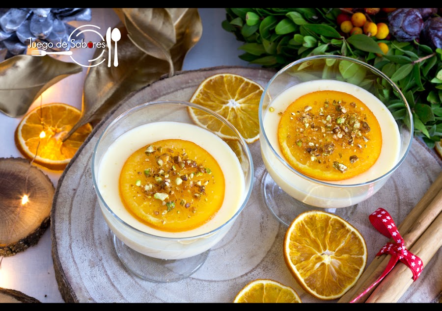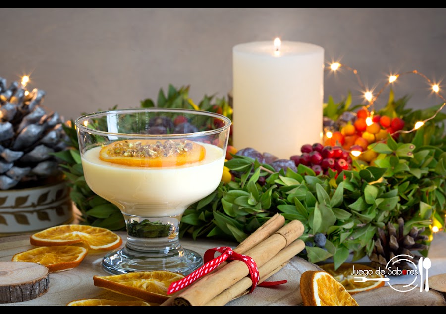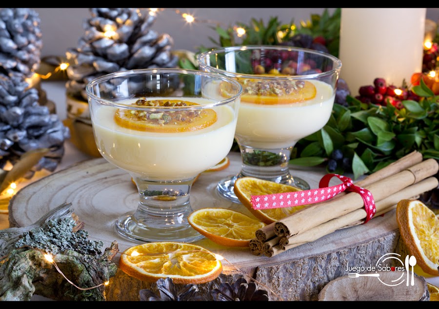 Después de una buena cena de Nochebuena o una comida de Navidad o Año Nuevo lo que a veces menos apetece tomar es el postre. Das por hecho que la gente ya está llena y casi da apuro aparecer con una bandeja con estas copas de crema con naranja confitada. Enfilas el pasillo que va de la cocina al comedor con cierto temor y cuando te acercas a la mesa dices con un hilillo de voz, como pidiendo perdón: “Si alguien quiere algo de postre…”, con el pleno convencimiento de que dirán que no, “déjalo para después, que a mí ya no me cabe nada”. ¡Error! A mi familia e invitados siempre les queda un huequecito en el estómago y encima te dicen: “Si hombre, te crees que nos vamos a perder lo mejor de la cena…” Y la verdad sea dicha, y sin desmerecer los entrantes y los platos siguientes, este postre pese a su sencillez es de 10 porque tiene un toque memorable, la naranja confitada. Se puede hacer en cualquier época del año, pero a nosotras nos ha parecido bien revestirlo de Navidad.