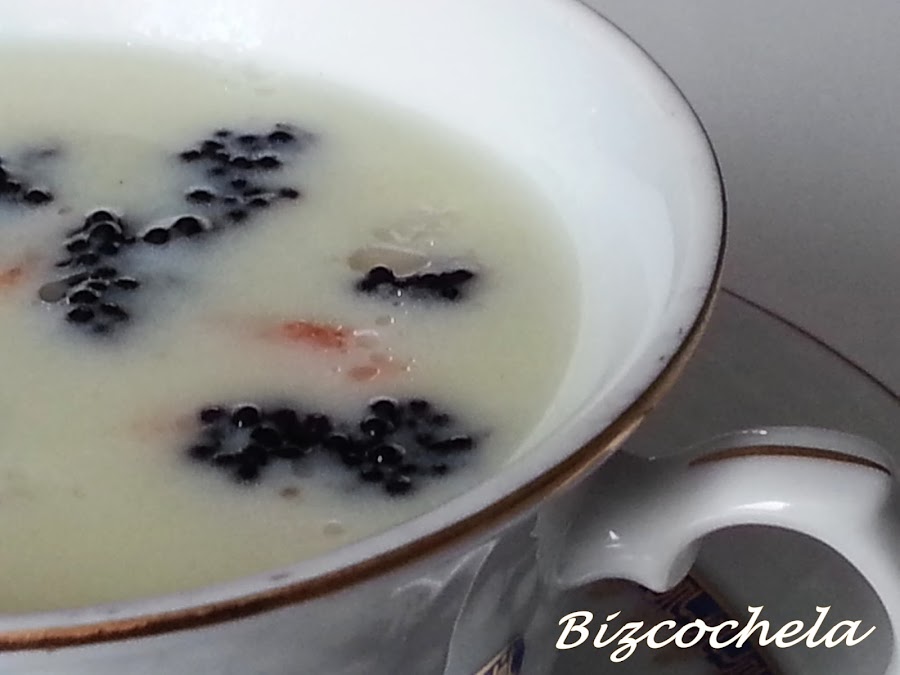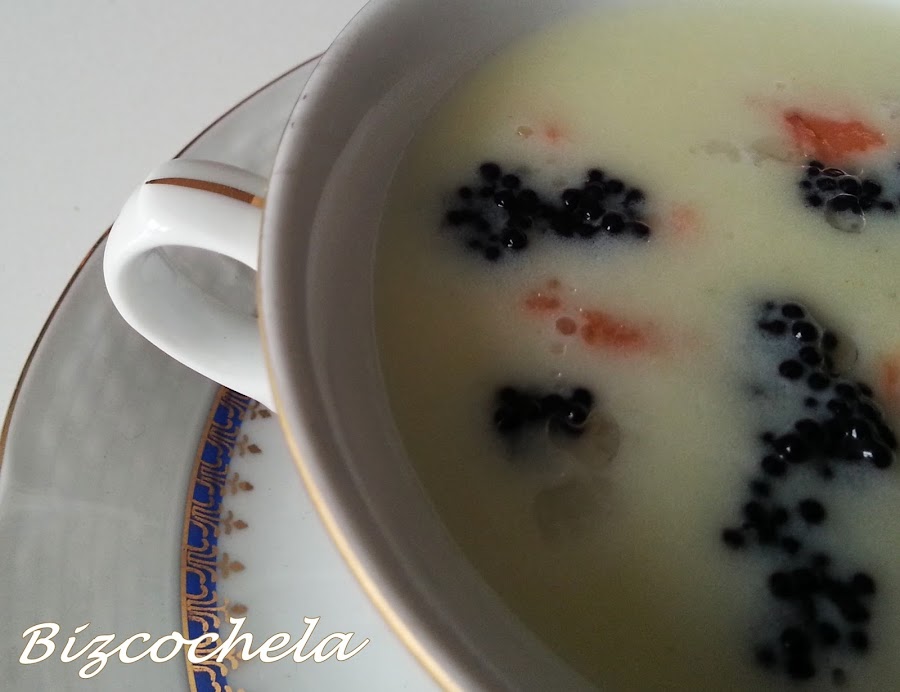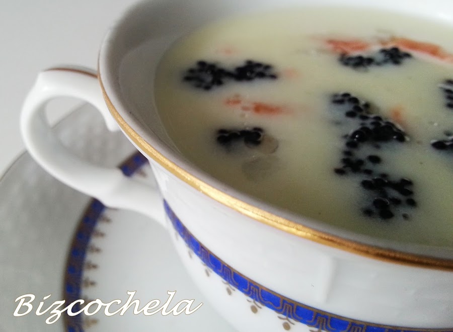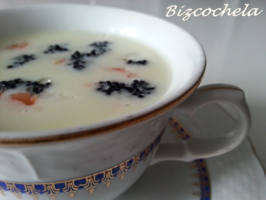 5. - Añadimos la nata (crema de leche), mezclamos, rectificamos de sal y servimos en platos o tazas de consomé, donde habremos puesto los ahumados en el fondo.