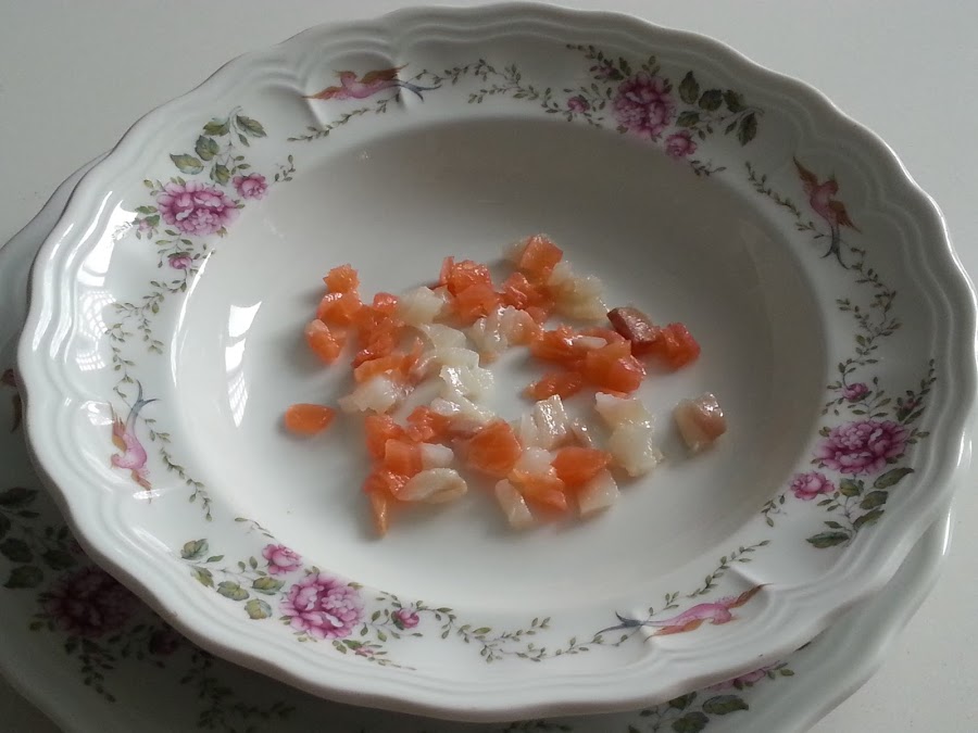 3. - Mientras picamos muy finos el bacalao y el salmón, o el ahumado que hayamos elegido.