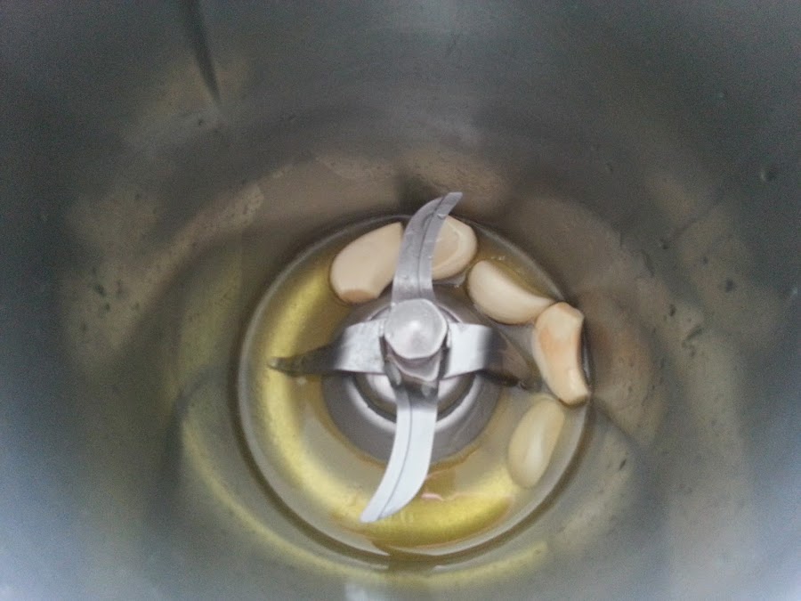 1. - Ponemos el aceite y los dientes de ajo enteros y pelados en una cacerola, aunque yo lo hago en la termo.