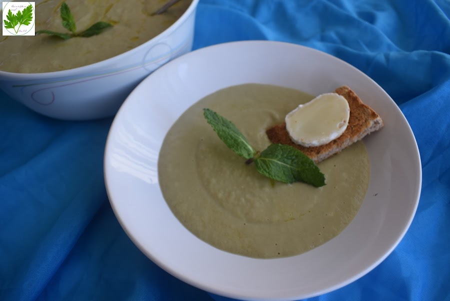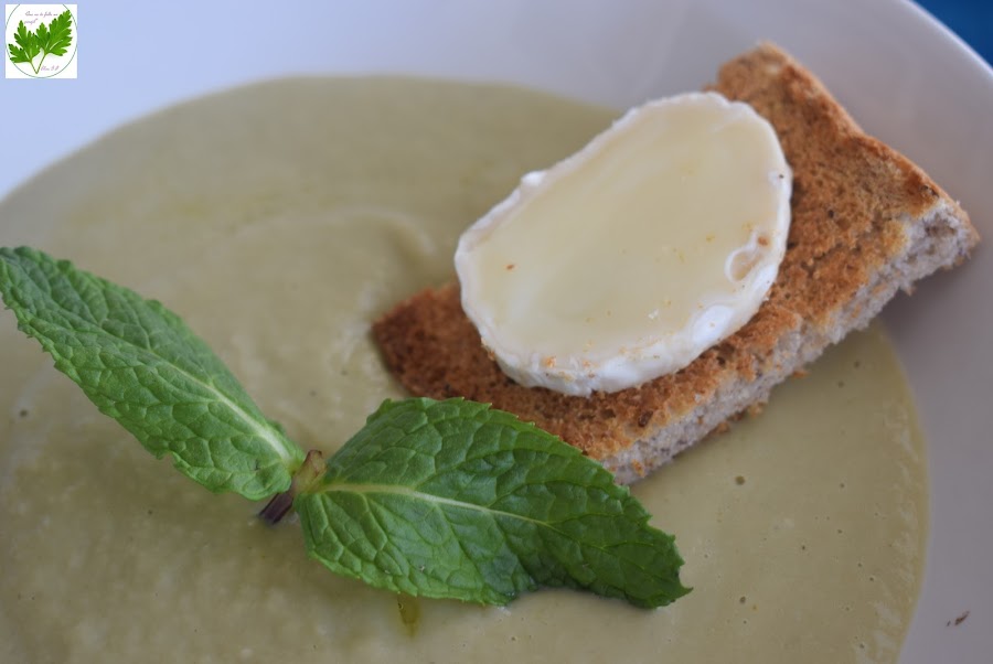 Sirve acompañada de unas tostas de pan de centeno con queso de cabra, adorna con las hojitas de hierbabuena y rocía con un poco de AOVE.