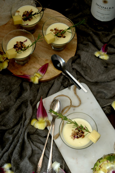 Empezamos el mes de marzo con una receta muy rica y saludable, que además queda estupendamente como entrante en cualquier celebración que tengas. Es una crema de alcachofas junto con una mousse de queso Idiazábal. En la decoración hemos puesto nueces pecanas y tomates desecados.