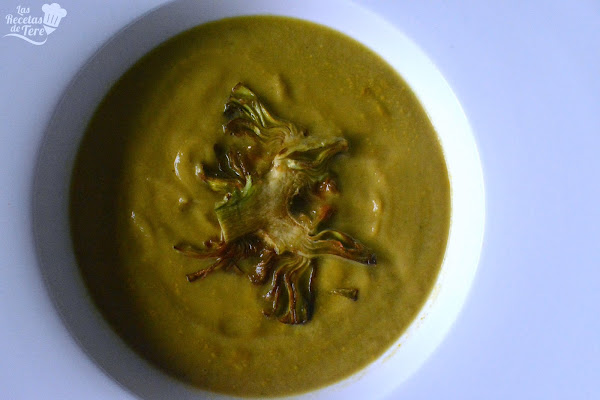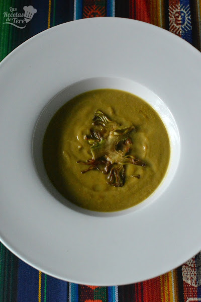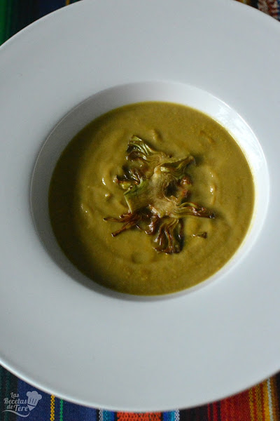 Puedes terminar la crema con unos croutons o con unos chips de alcahofa, simplemente corta la alcahofa cruda ya pelada muy delgada, enharinalos con harina especial para rebozados y fríe con abundante aceite