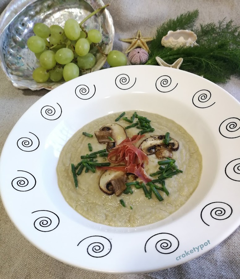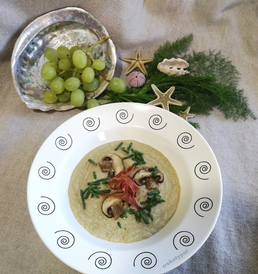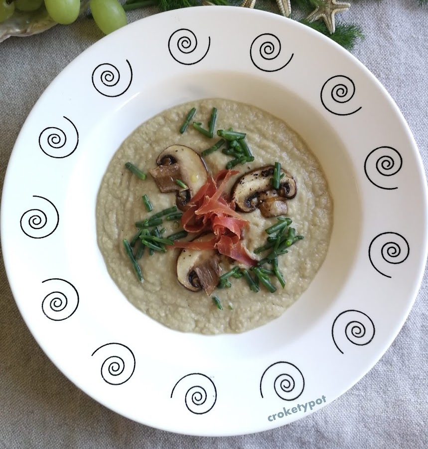 Así ha sido muy inspirador para elaborar mi aportación a nuestra cita mensual y para iniciar el año con una receta muy depurativa, la Crema de Alcachofas, con ingredientes que hubiera indicado Gaudí, como las almendras, la cebolla, los champiñones, está terminada con un poco jamón y salicornia, una combinación mar y montaña de gran contraste.