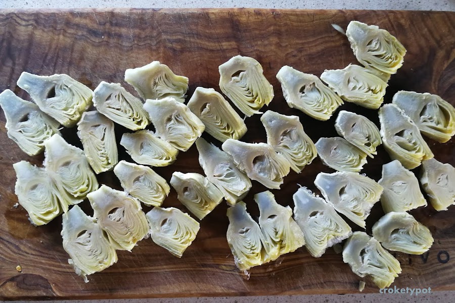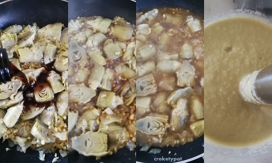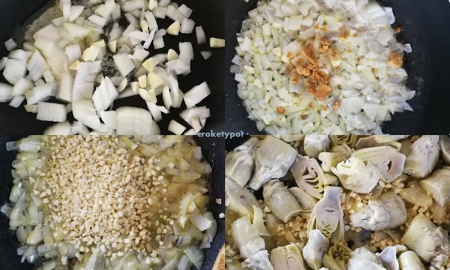 ELABORACIÓN: En una sartén ponemos la cebolla y el ajo picados con la mantequilla, y pochamos, añadimos la almendra, se mueve bien, añadimos la 1/2 pastilla de caldo y movemos partimos los corazones de alcachofas y los pasamos a la sartén, lo movemos todo.