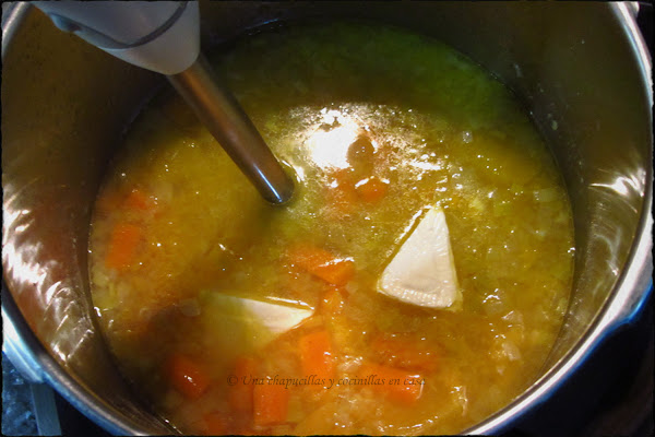 Cerrar la olla a presión y cocer todo unos 20 minutos. Pasado ese tiempo, abrir la olla cuando se haya ido la presión y añadirle un par de quesitos. Triturar todo con una batidora, hasta que quede una crema suave. Probar de sal y rectificar si fuera necesario.