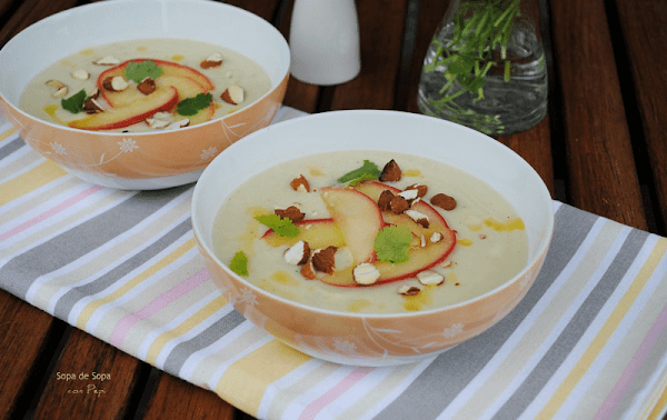 Para servir, poner la sopa en cuencos individuales, repartirle por encima los gajos de manzana con el jugo que han soltado, y espolvorear con las avellanas y las hojas de perejil reservadas.