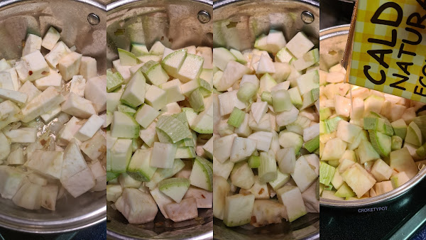 ELABORACIÓN: En una olla ponemos un poco de aceite de oliva y una nuez de mantequilla, añadimos la cebolla troceada y dejamos 5 minutos pocharse, añadimos el apio nabo troceado, el calabacín y el hinojo, salteamos 10 minutos y le ponemos el caldo hasta cubrir la verdura.