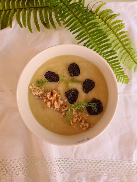Medio calabacín blanco, un trozo de hinojo, media cebolla, caldo de ave o de verduras, sal y pimienta blanca, aceite de oliva Aove y un poco de mantequilla. Para terminar la crema le hemos puesto nueces y unas láminas de trufa, podemos ponerle también manzana que le va muy bien.
