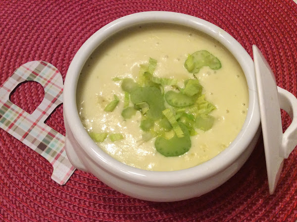 Servimos acompañada de pequeños trozos de apio crudo y un hilo de aceite de oliva.