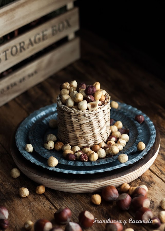 Precalentamos el horno a 150º calor arriba y abajo, mientras tanto terminamos de quitarle la piel a las avellanas para que queden bien limpias