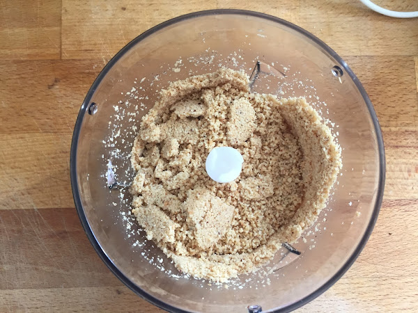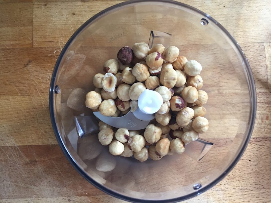 Primero ponemos las avellanas en la picadora de la batidora o en la thermomix y las molemos hasta que tengamos una especie de polvo de avellanas.