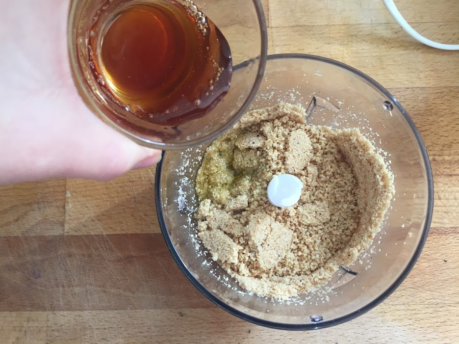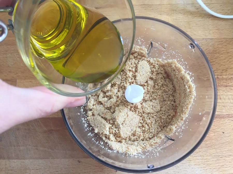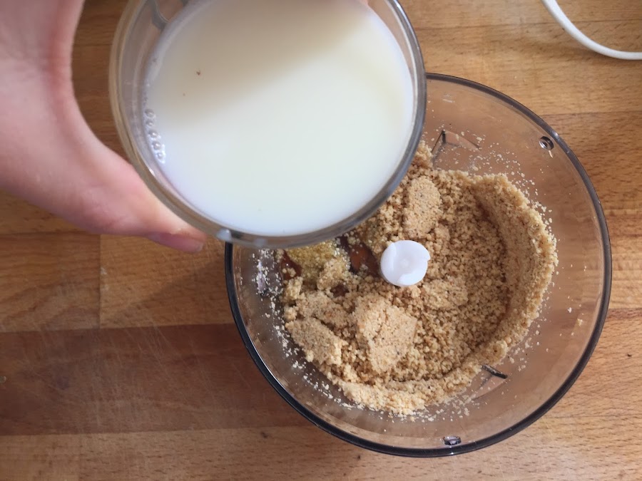 Después calentamos la miel para que podamos manejarla mejor y la vertemos encima del polvo de avellanas junto con el aceite y la leche.