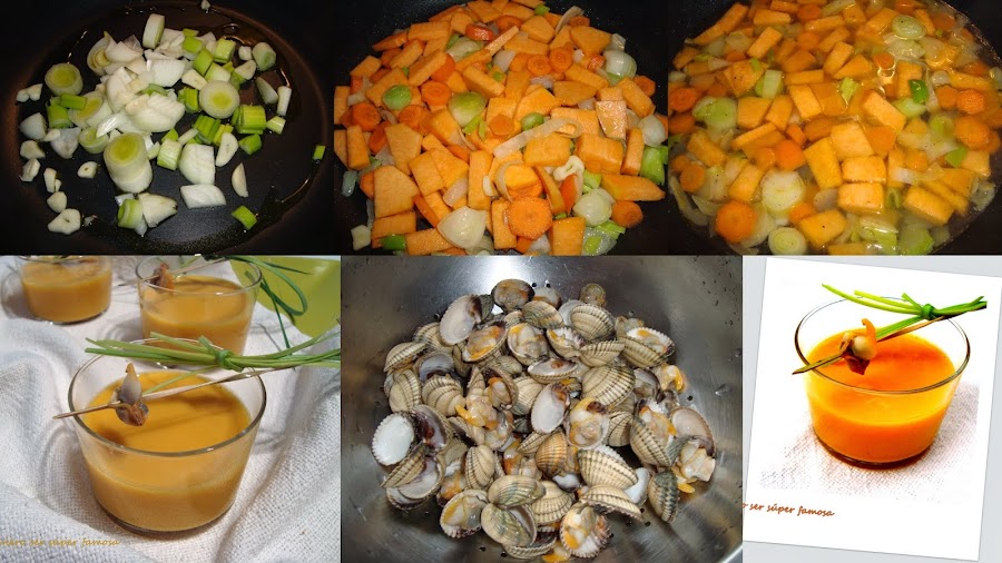 En una sartén o cazuela sofreír todas las hortalizas. Primero la cebolla, puerro, cebolleta y ajos a laminas. Cuando se empiecen a pochar añadir la calabaza y las zanahorias. Condimentar con sal y pimienta blanca. Esta especia le queda muy bien a la crema de berberechos.