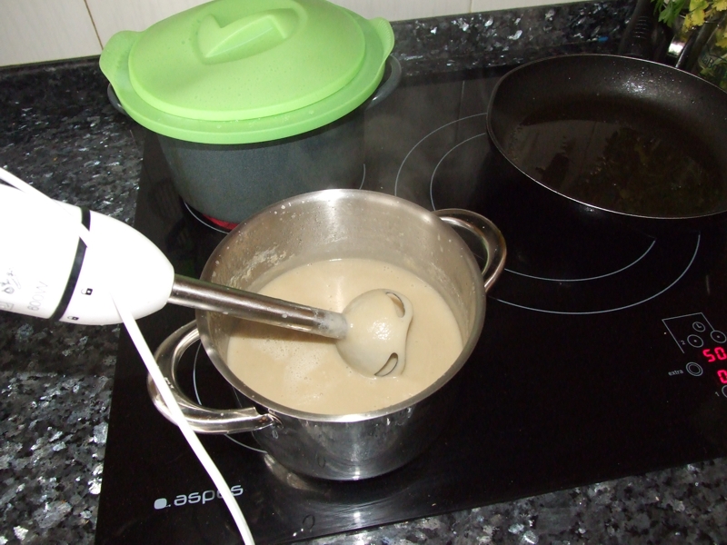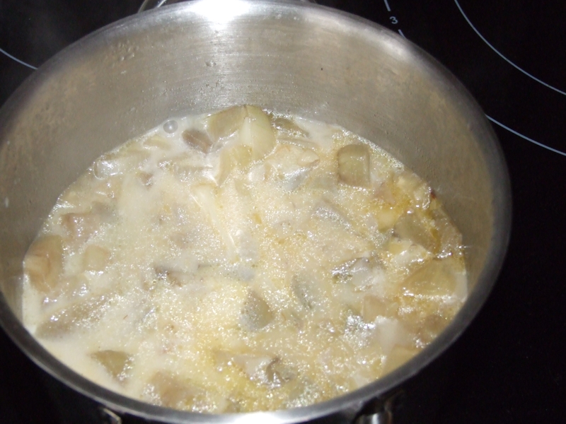 Dejamos que hieva unos 15 minutos o hasta que las patatas y la berenjena estén bien blandas, apagamos y añadimos la leche, batimos con la batidora de mano o de vaso y agregamos el caldo de pollo.