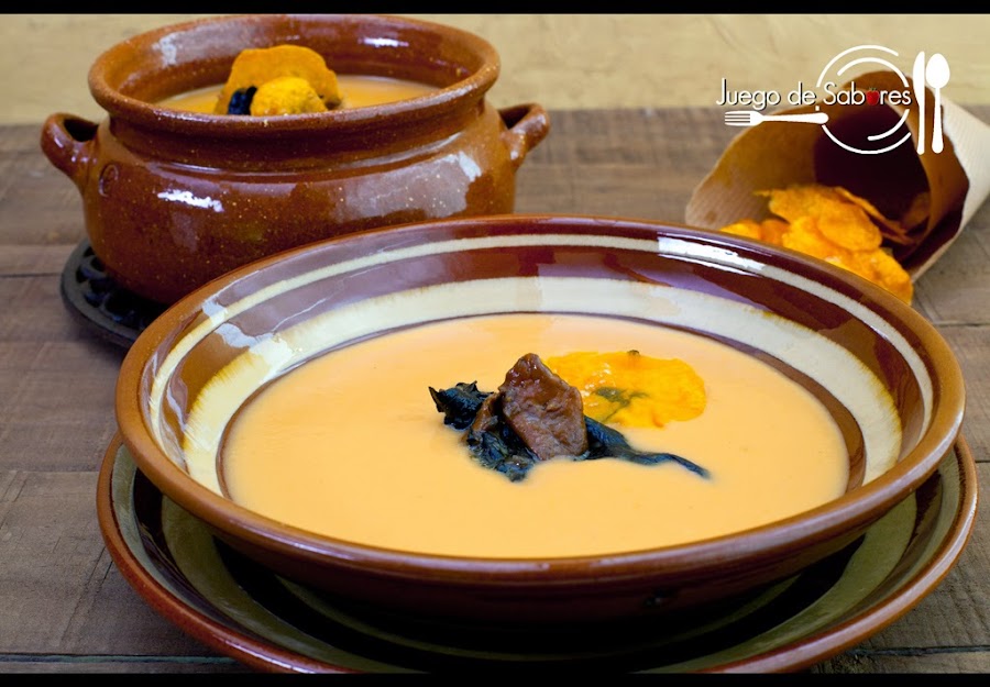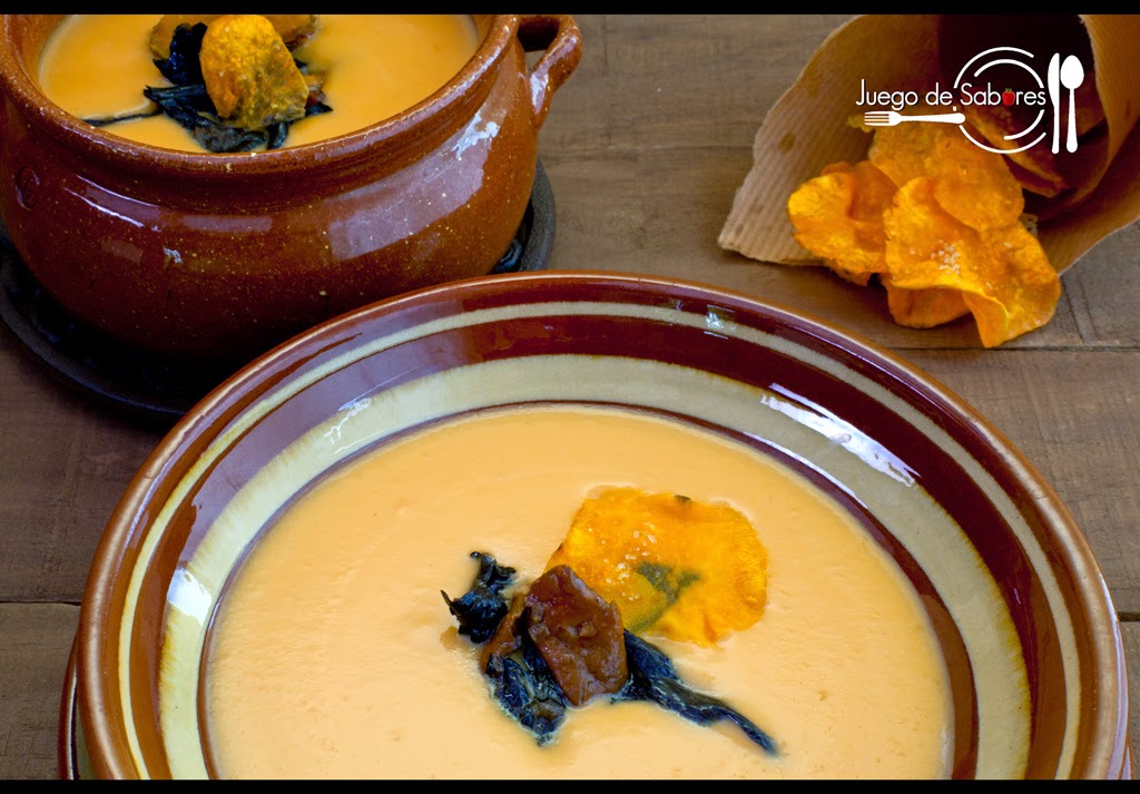 Recordaréis que hace tiempo os presentamos una "Crema fría de calabaza", pero el boniato no lo habíamos usado hasta ahora como ingrediente en nuestro blog. Nos faltaba esa sugerencia, esa idea, ese empujoncito que te lleva directa a la cocina y que hace que no salgas de ella hasta no tener un plato extraordinario que completas con unos chips crujientes de boniato y unas "trompetas de la muerte" o "Craterellus cornucopioides", que son unas setas de nombre siniestro, de color fúnebre, pero de sabor excelso que contrasta con el dulce del boniato. Todo un acierto.