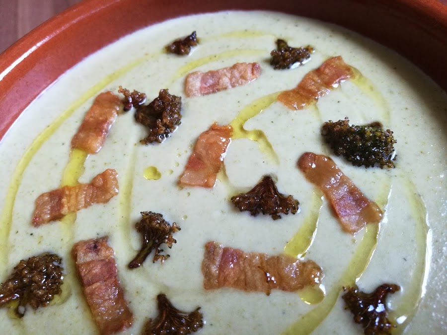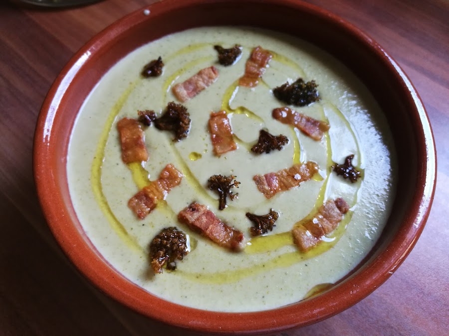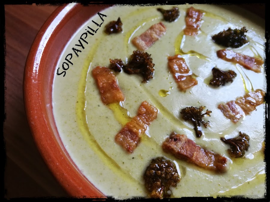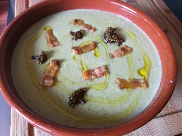 - En una sartén salteamos el bacon y los mini ramilletes de brócoli hasta dorar, y los serviremos por encima de la crema para decorar, junto con un chorrito de aceite de oliva.
