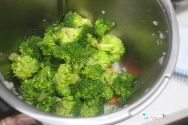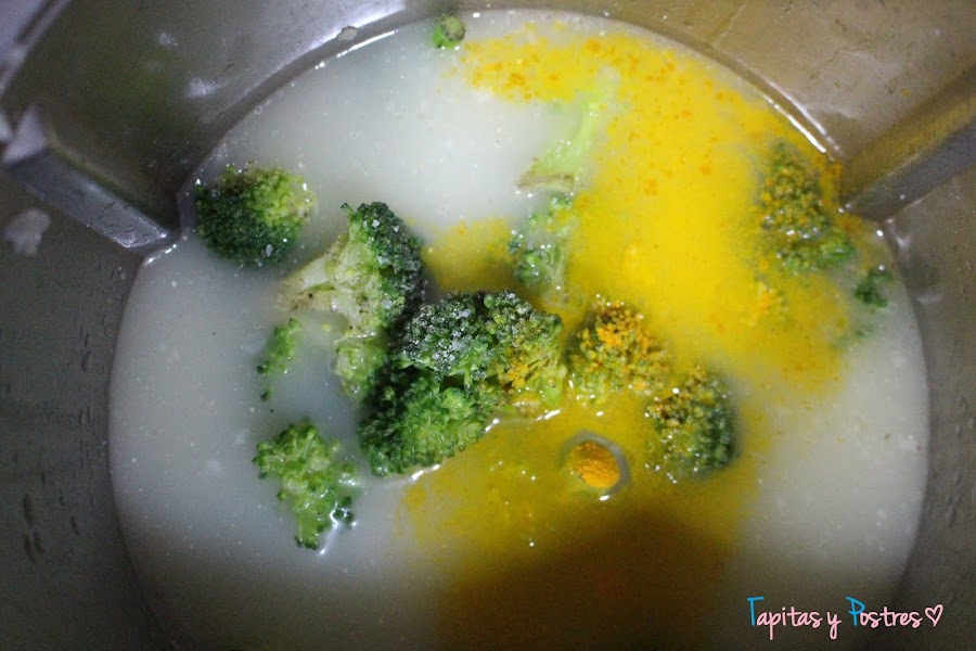 Incorporamos el brócoli en ramitos, la zanahoria a trozos, el caldo, la sal, la pimienta y la cúrcuma. Cocinamos 20 minutos a 100º y velocidad 1. Al acabar agregamos el queso que teníamos reservado pero dejamos que baje la temperatura un poco antes de triturar 30 segundos a velocidad a velocidad progresiva 8-10.