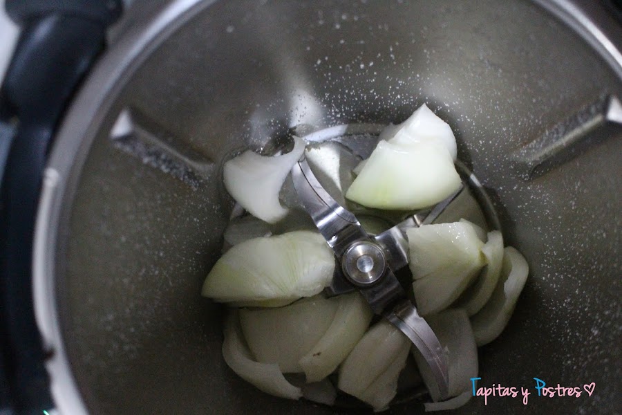 Ponemos la cebolla cortada a cuartos, el diente de ajo y el aceite. Picamos 5 segundos a velocidad 5.