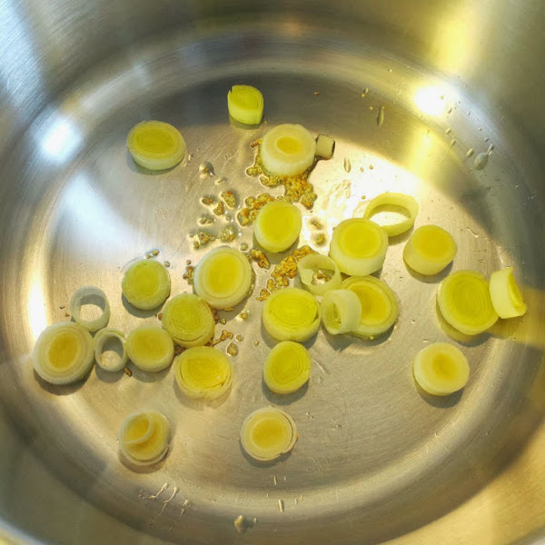 5. Directamente, sin necesidad de que se dore el ajo, añade el puerro y rehoga. Cuidado que no se queme el ajo.