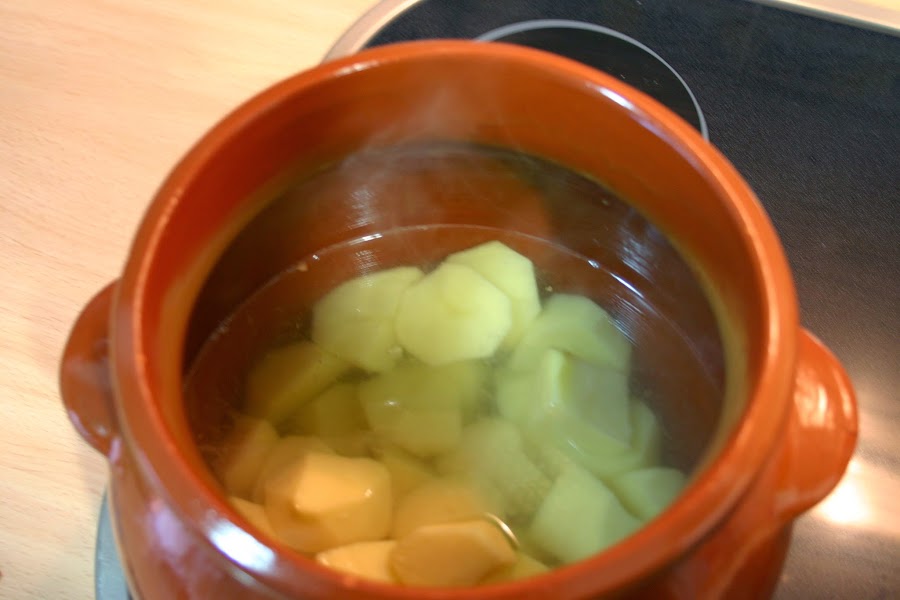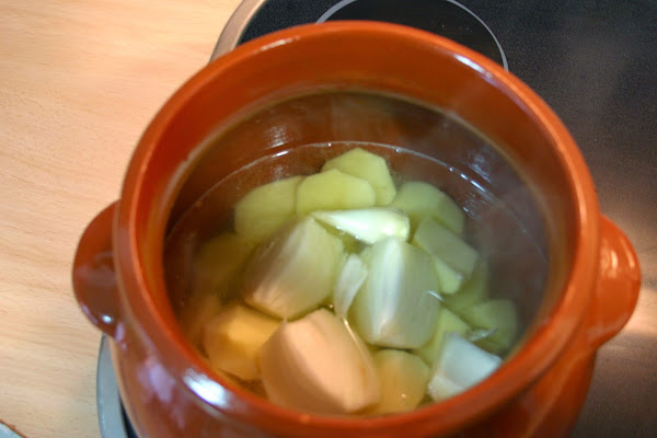 y lo vamos metiendo en la fuente elegida, (a mi me gusta cocinar en barro, tengo un amigo ferretero que vende unos pucheros increiblemente buenos y baratos), primero las patatas