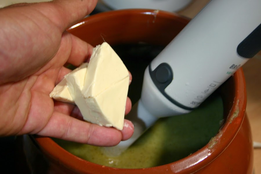 cuandop este bien batido, añadimos un chorrito de aceite y los quesitos y lo volvemos a batir todo para que emulsione y quede chapó