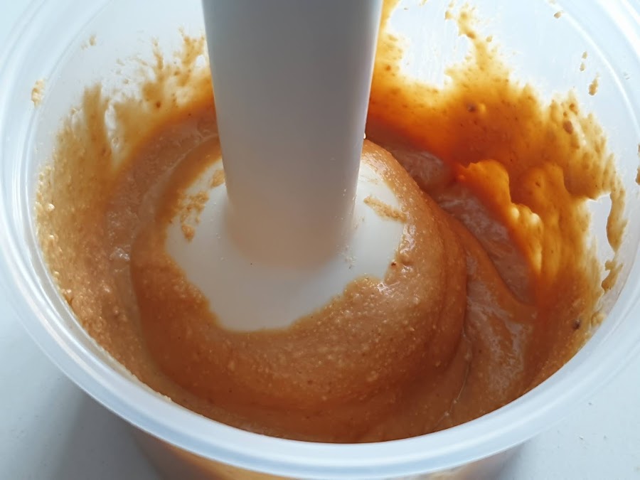 Yo he hecho poca cantidad, porque realmente no se puede usar a diario, así que debéis calcular que de 250 gramos de cacahuetes sin pelar, se obtiene la mitad de manteca o crema, me han salido 120 gramos de crema.